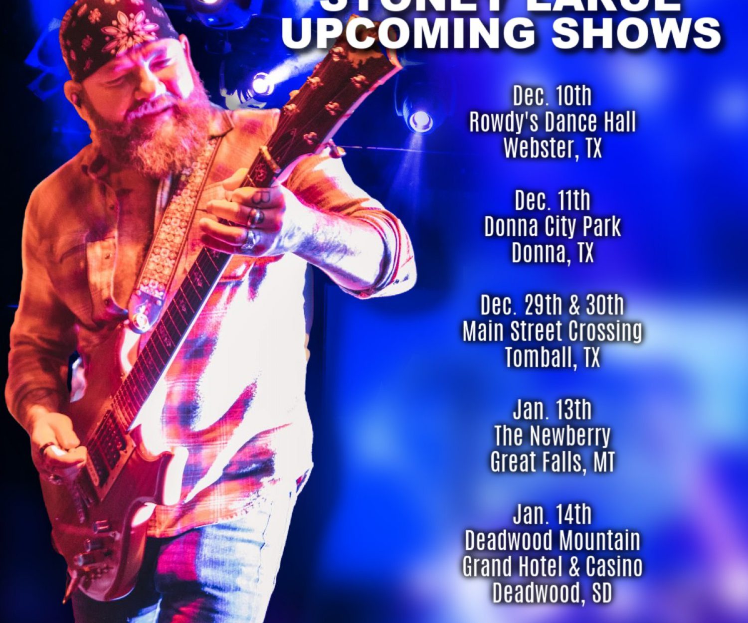 Tour Information 10 Dec 2021 Upcoming Stoney LaRue Tour Dates: Upcoming Stoney LaRue Tour Dates: Dec. 10th Rowdys Dance Hall Webster, TX Dec. 11th Donna City Park Donna, TX Dec.… Webmaster